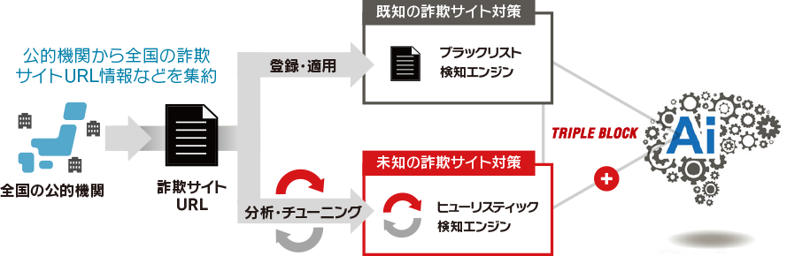 AIエンジンは、ヒューリスティック検知の元となる、専門家による詐欺サイトの分析・チューニングを機械学習で自動化することで、従来のヒューリスティックエンジンを補強し、スピードの速い犯罪者手口の変化にも追従できる検知能力を提供します。